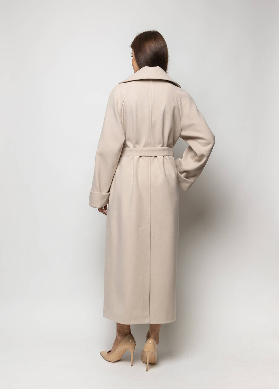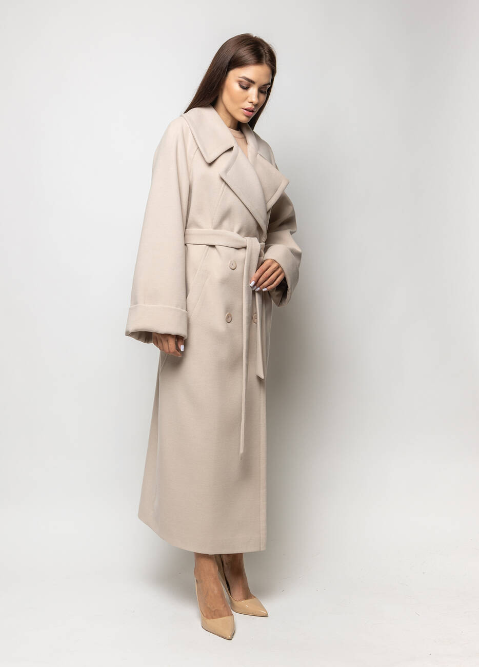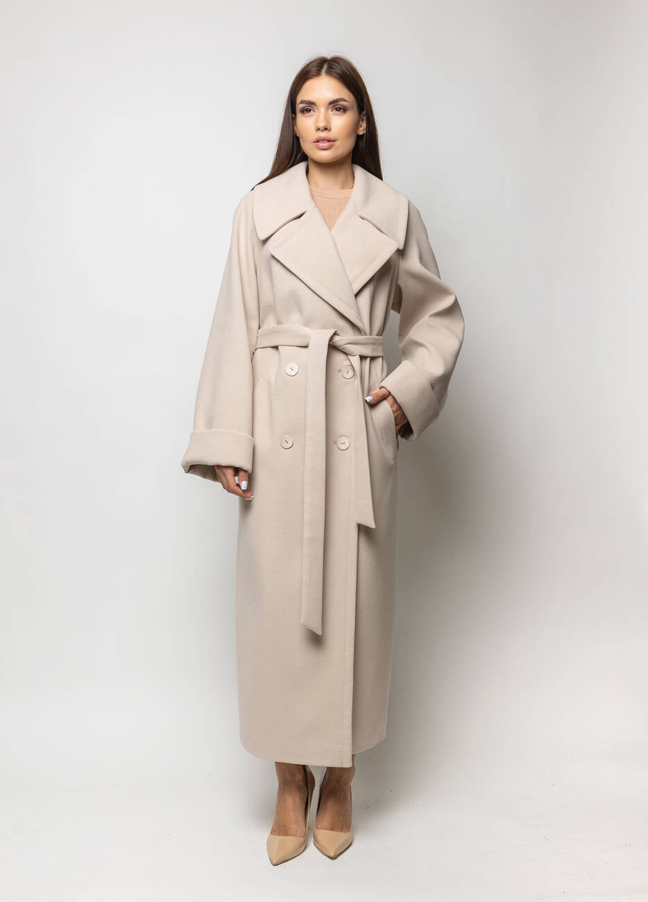 Пальто класичне жіноче Марсель стиль: оверсайз. Пальто двобортне.. Застібка на ґудзиках. Широкий відкладний комір. Кишені листочка. Пояс у комплекті. Довжина спинки 125 см, довжина рукава від горловини 73 см.