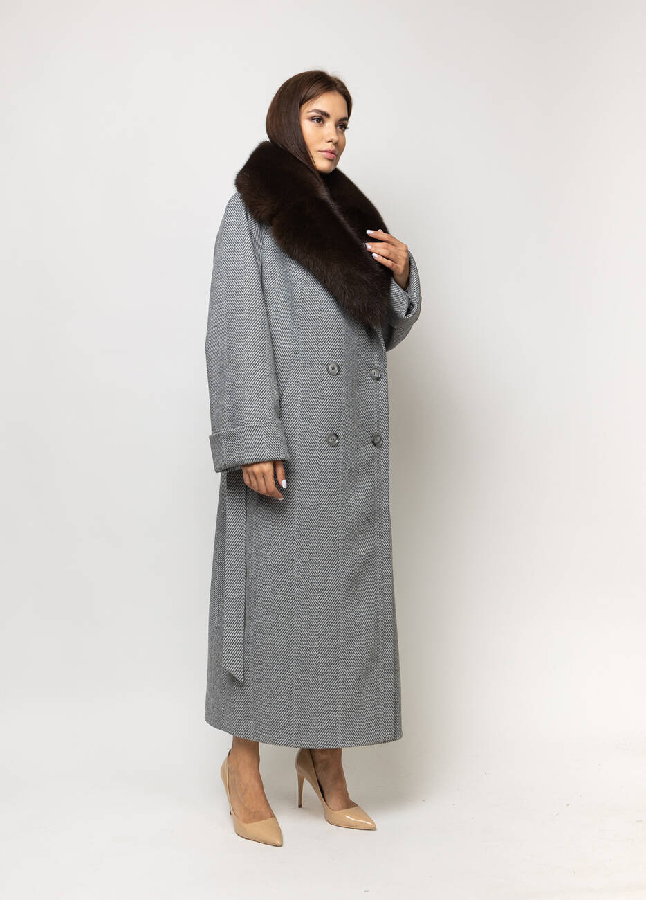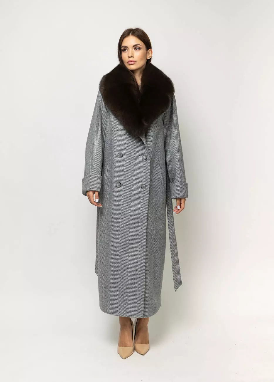 Пальто класичне жіноче Марсель стиль: оверсайз. Пальто двобортне.. Застібка на ґудзиках. Широкий відкладний комір. Хутро натуральне, Кишені листочка. Пояс у комплекті. Довжина спинки 125 см, довжина рукава від горловини 73 см.